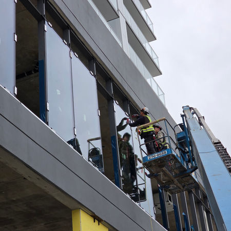 Georgetown 2, Surrey, BC — Installation of extensive curtain wall systems across the tower podium, including full glazing for adjacent restaurant and glass canopies.
